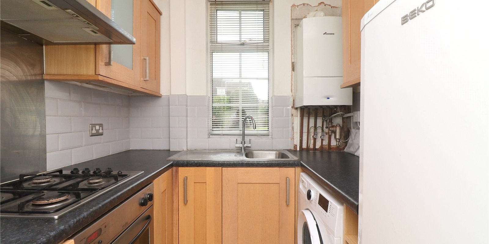 Upon entering the property you're greeted by a hallway with storage space to the right and the kitchen in front. The kitchen has ample counter and cupboard space for all your culinary needs and is also home to the boiler, as this flat is equipped with a central heating system. The lounge/diner is an open plan space with hardwood flooring and bay windows, flooding the room with natural light. Off the living room to the rear, is another hallway connecting the two bedrooms and the family bathroom that services the flat.