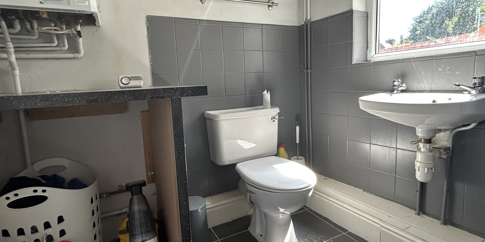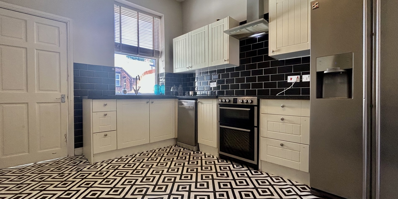 To the rear, the kitchen/dining area is fitted with a range of wall and base units, tiled splashbacks, and stylish mosaic-style lino flooring. This versatile space leads out to a rear garden via a back door, and also offers access to a convenient downstairs WC which would be a great space for an additional shower room.