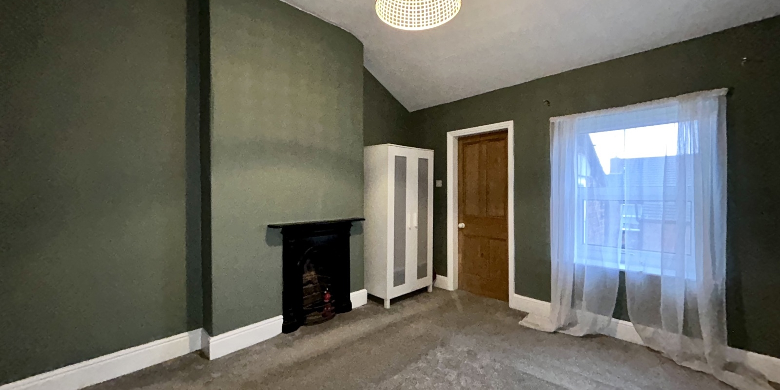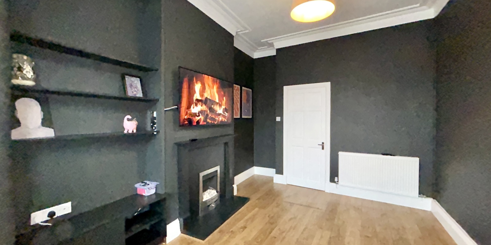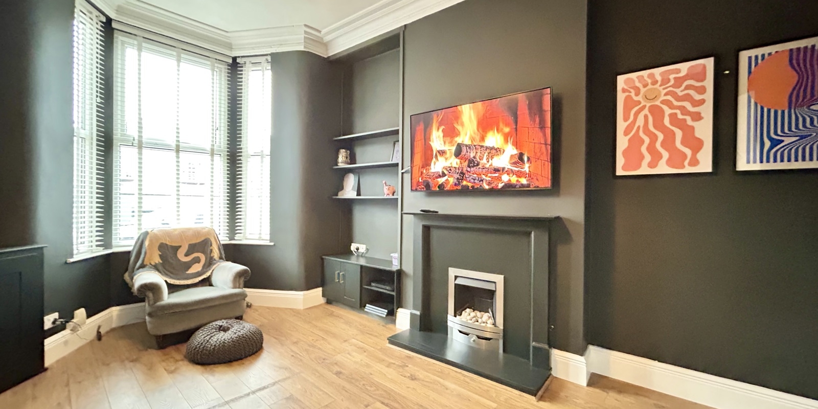 Step inside to find a bright and spacious lounge with a beautiful bay window, high ceilings, and wood-effect laminate flooring that enhances the sense of space and light. A gas feature fireplace adds a cosy focal point to this welcoming room.