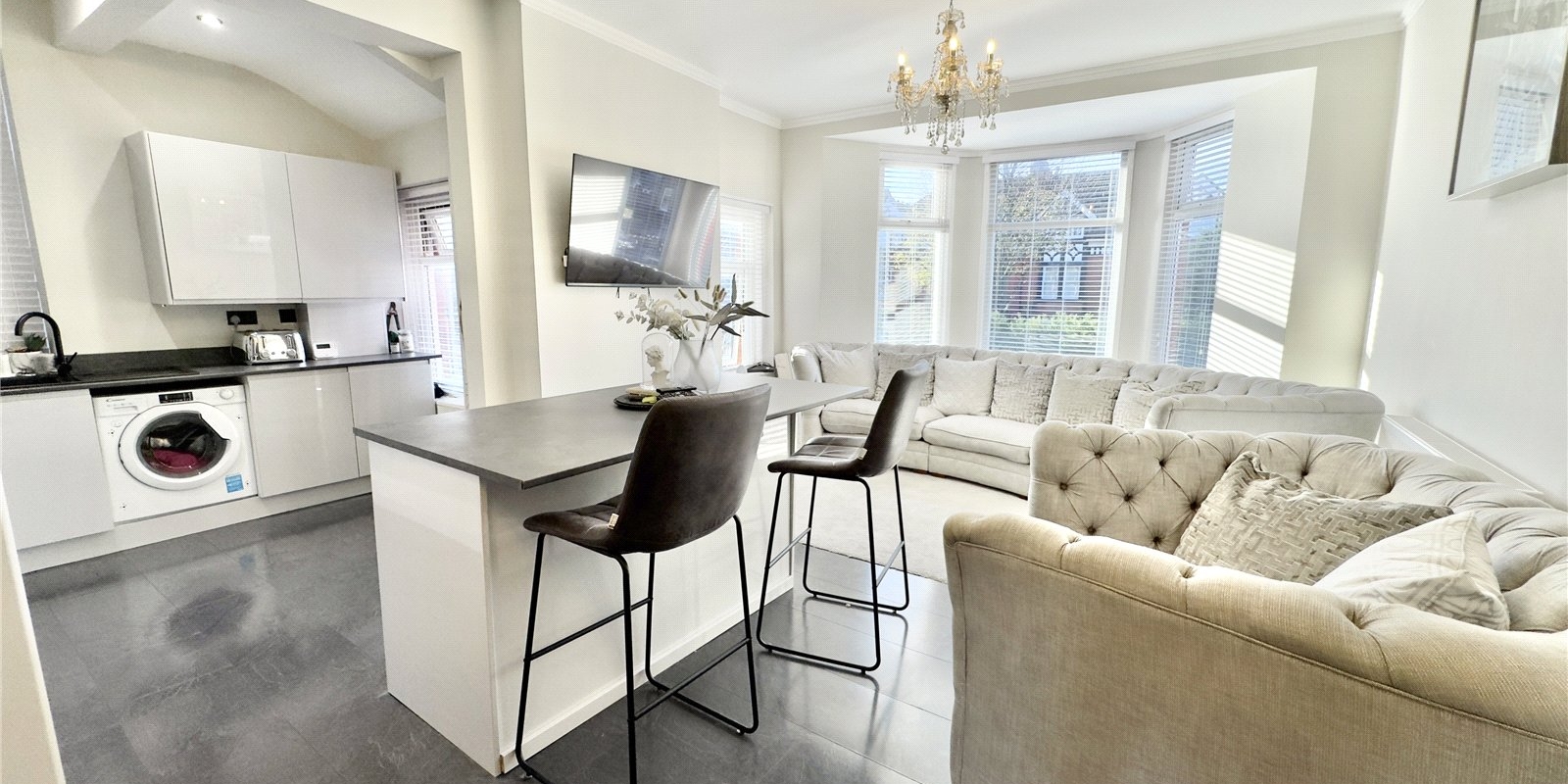 Upstairs, the property opens out into an impressive open-plan kitchen, dining and living area. Bathed in natural light from a striking bay window, this versatile space combines modern design with a sense of calm and openness. The newly installed kitchen features sleek grey cabinetry and a sizeable central island, perfect for relaxed meals or entertaining friends.