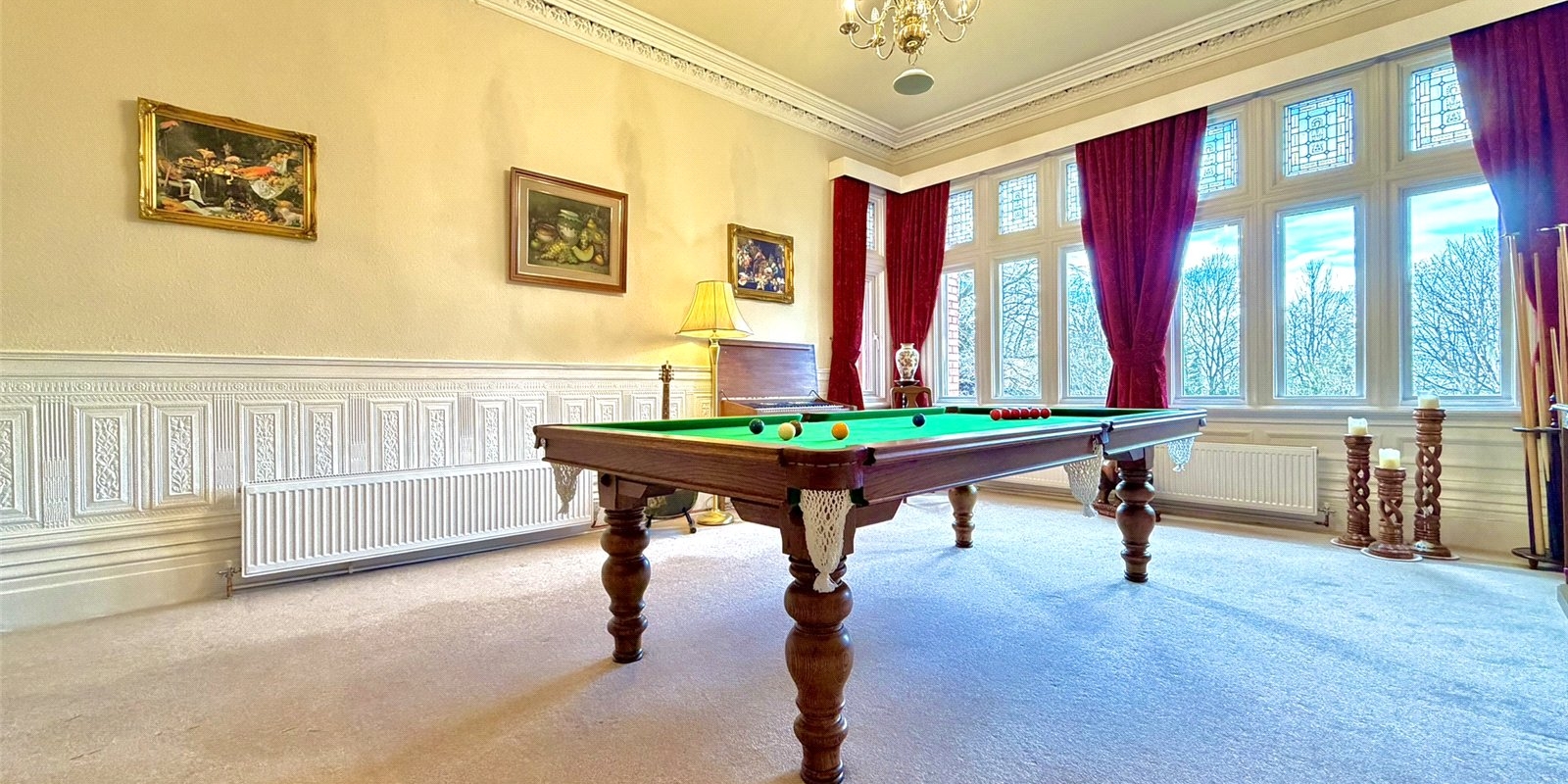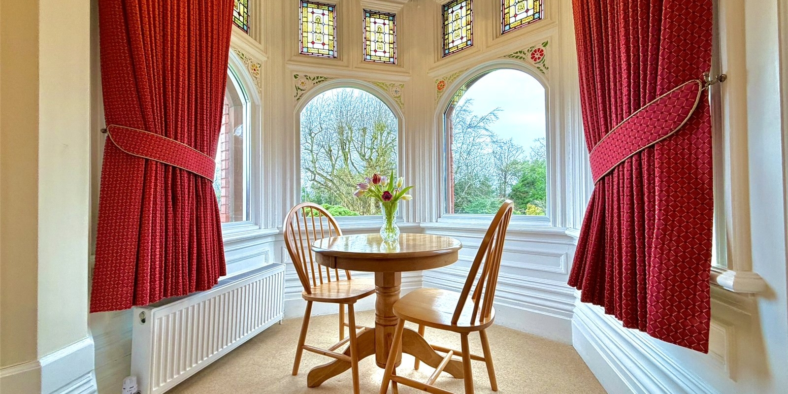 A second reception room offers a more intimate snug-style space, complete with original wood panelling, stained glass windows and a characterful feature fireplace, while the third reception room serves as an elegant formal dining room.