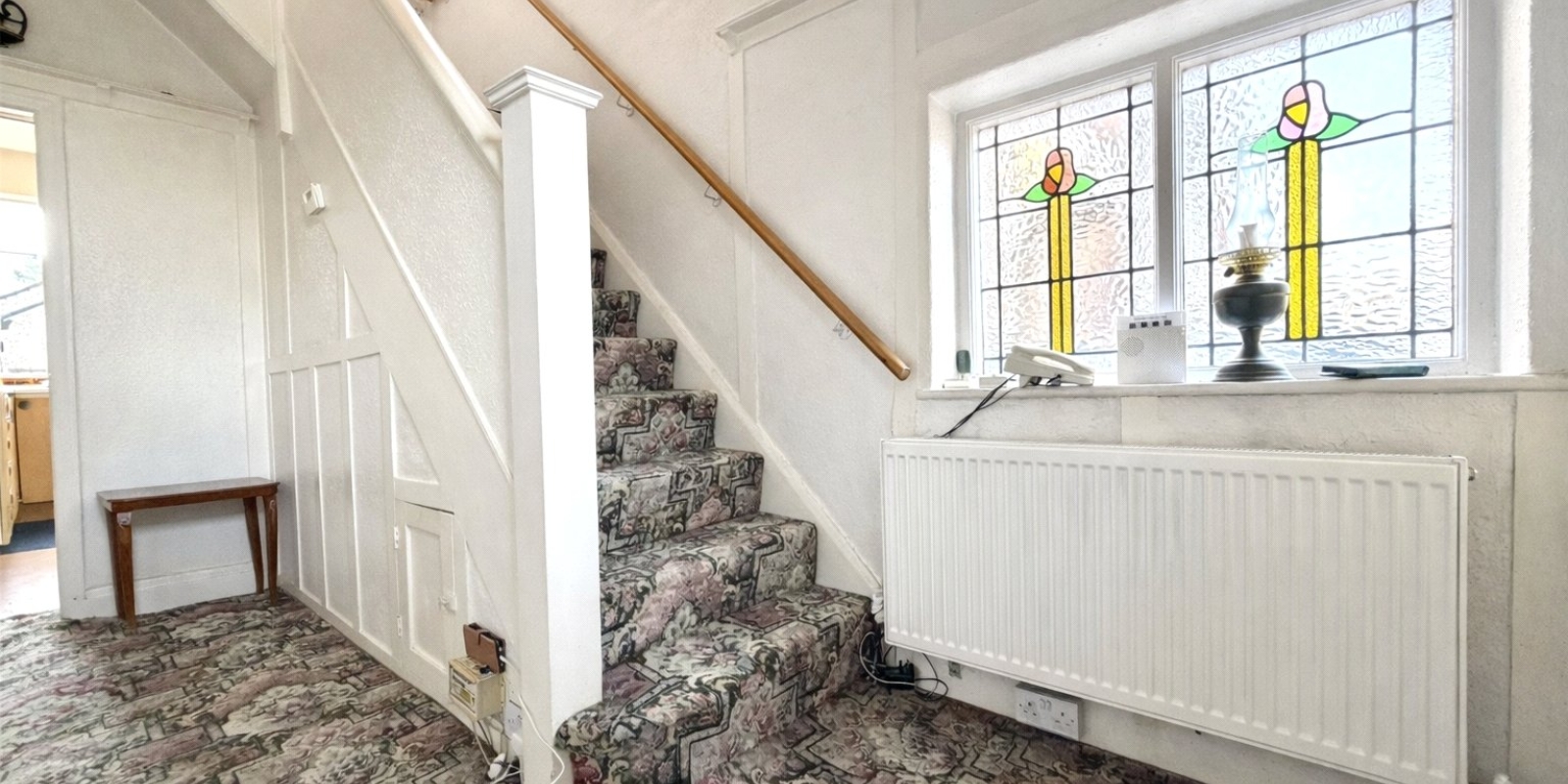 This charming property retains a wealth of original features, including beautiful leaded stained glass windows, giving a nod to its period heritage. The accommodation begins with a generous entrance hallway, leading through to two well-proportioned reception rooms, ideal for both family living and entertaining, along with a kitchen to the rear.