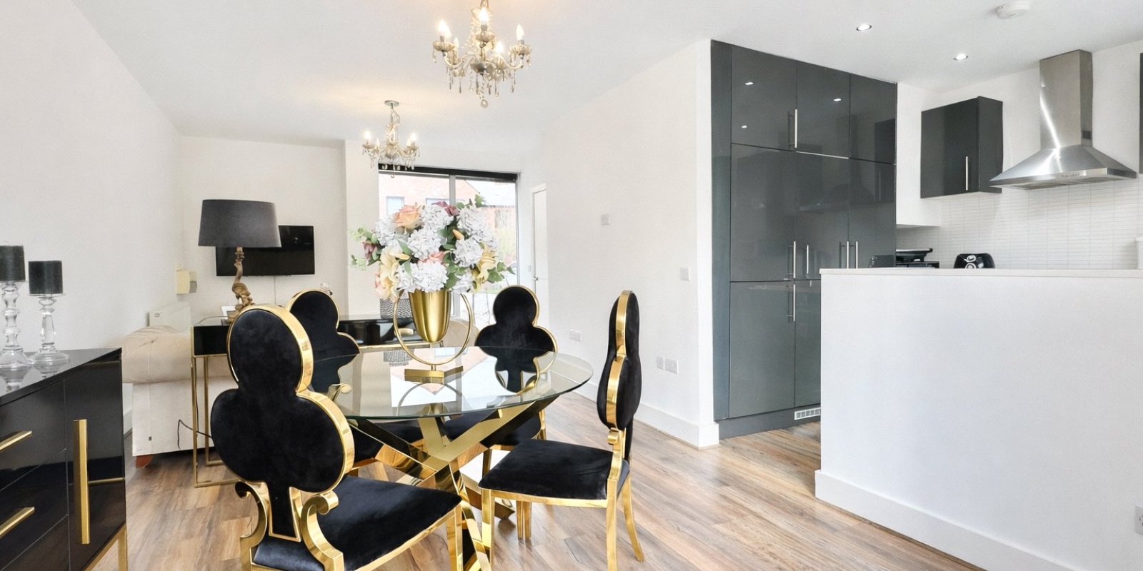 Upon entering, you are welcomed by an inviting entrance hallway with staircase rising to the first floor, a useful downstairs cloakroom and access through to the impressive open-plan living space. The bright and spacious living room features a striking floor-to-ceiling window to the front, flooding the room with natural light and creating a modern, airy feel. This flows seamlessly into the dining area and contemporary fitted kitchen, forming the true heart of the home. From here, stylish bi-folding doors open out onto the enclosed rear garden, providing the perfect setting for entertaining or relaxing during warmer months.