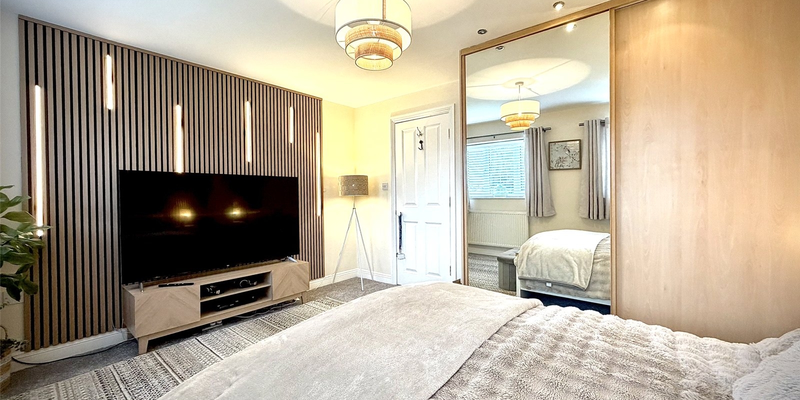 Upstairs, the spacious landing provides access to three well-proportioned bedrooms. The principal bedroom spans the full width of the property and benefits from dual aspect windows overlooking the garden, bespoke fitted wardrobes, and feature acoustic panelling. The second bedroom is a generous double with feature wall, while the third is a well-sized single. A modern family bathroom completes the first floor.