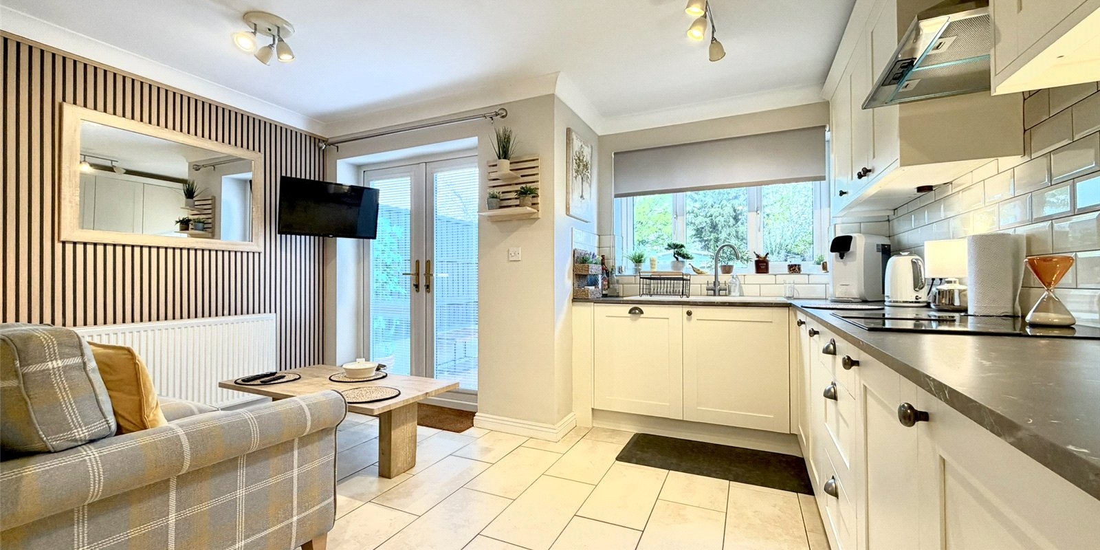 Internally, the property welcomes you with a stylish entrance hallway featuring contemporary acoustic wall panelling and ambient lighting, setting the tone for the quality found throughout. A convenient downstairs WC and staircase lead from the hallway, with access into a bright and airy lounge complete with engineered wood flooring and a feature electric fireplace. To the rear, the home opens into a stunning kitchen/dining/living space, designed in a modern country style and ideal for entertaining, complemented by a useful utility room and understairs storage. Double French doors lead seamlessly onto the landscaped rear garden.
