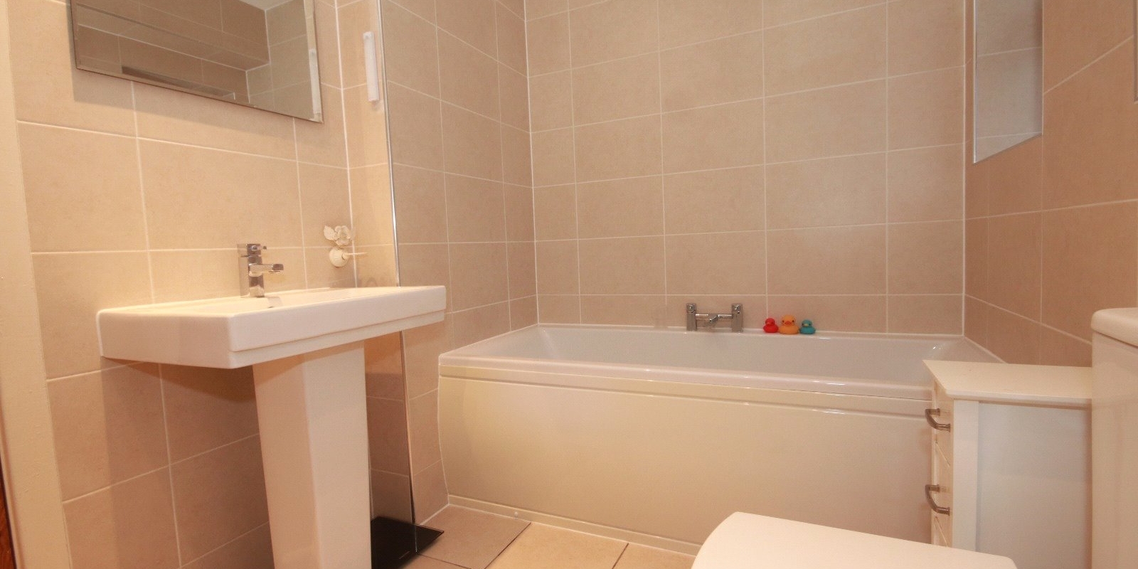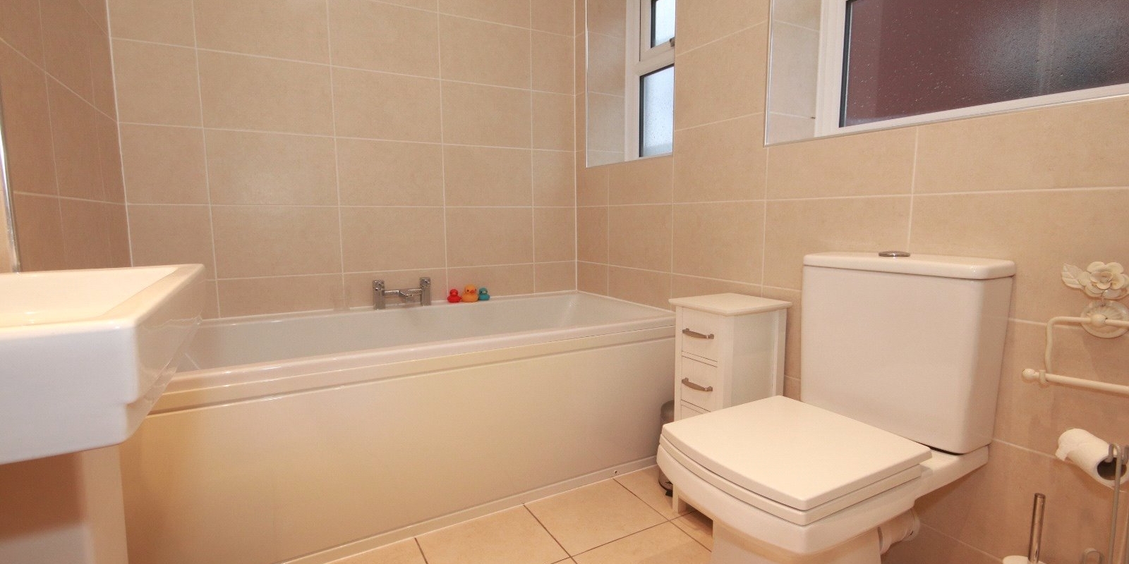 Upstairs, the first floor offers three bedrooms, all providing comfortable accommodation for a growing family or working professionals. The spacious modern family bathroom boasts a sleek, contemporary suite, including a bath, separate shower, toilet, and sink.