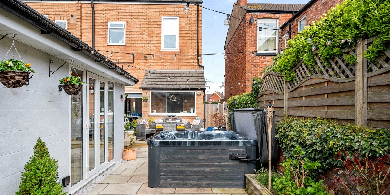 From here, doors lead out to a beautifully landscaped rear garden, featuring a paved patio area ideal for outdoor dining and entertaining. The garden is private, well-maintained, and designed for low maintenance while still offering a tranquil outdoor retreat.
