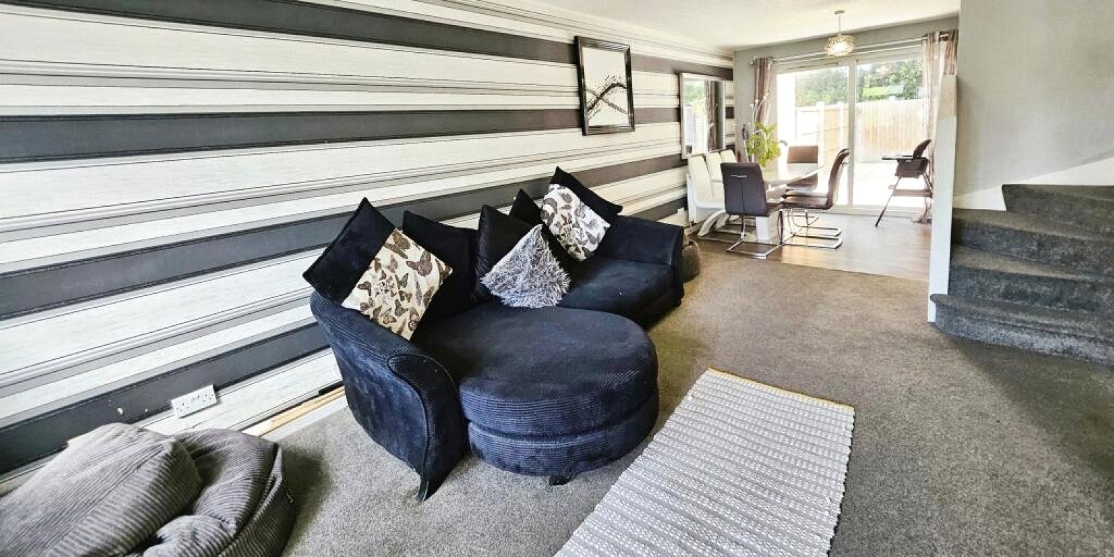 The ground floor offers a welcoming entrance porch leading into a spacious open-plan living and dining area, which flows through to a modern fitted kitchen. There is also a separate cosy lounge, providing a second reception space.
