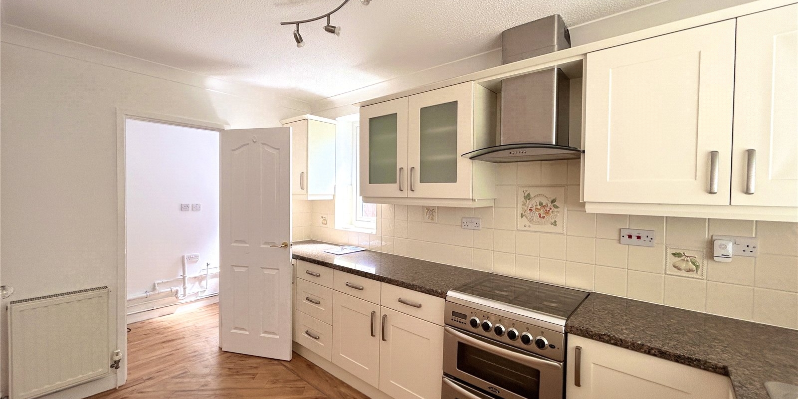 The modern kitchen is well-equipped with contemporary appliances and ample storage, complemented by a useful utility area offering further space for household essentials.