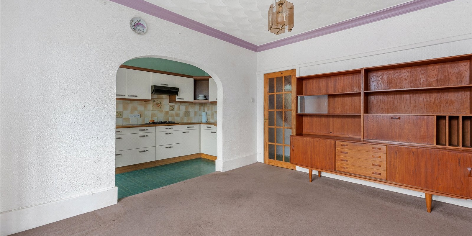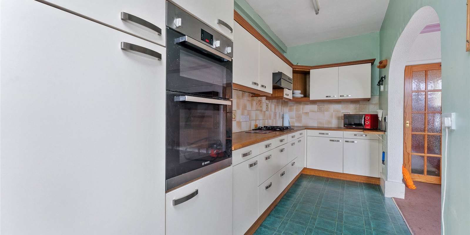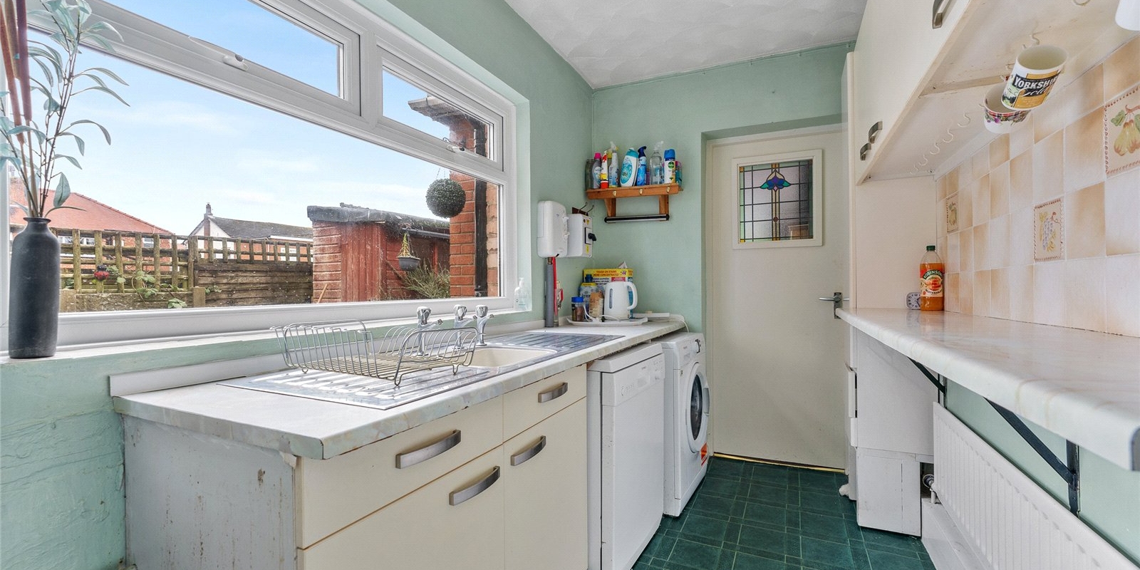 The kitchen is fitted with a range of wall and base units and finished with practical vinyl flooring. This space flows seamlessly into a useful utility room, while a UPVC patio door opens directly onto the rear garden, inviting in plenty of natural light.