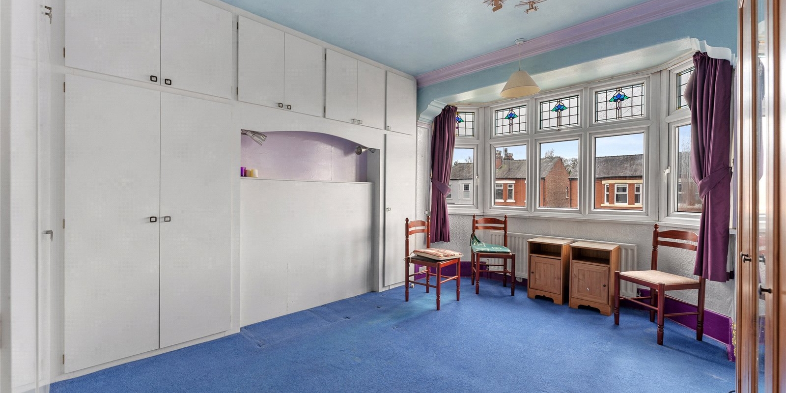 The master bedroom is a well-proportioned and impressive space, featuring fitted wardrobes for ample storage. A large bay window to the front elevation enhances the room with abundant natural light.