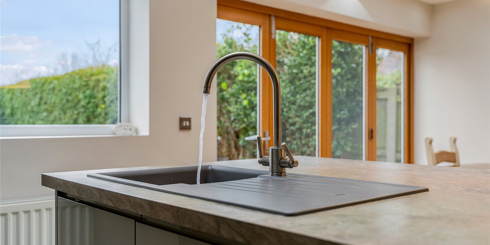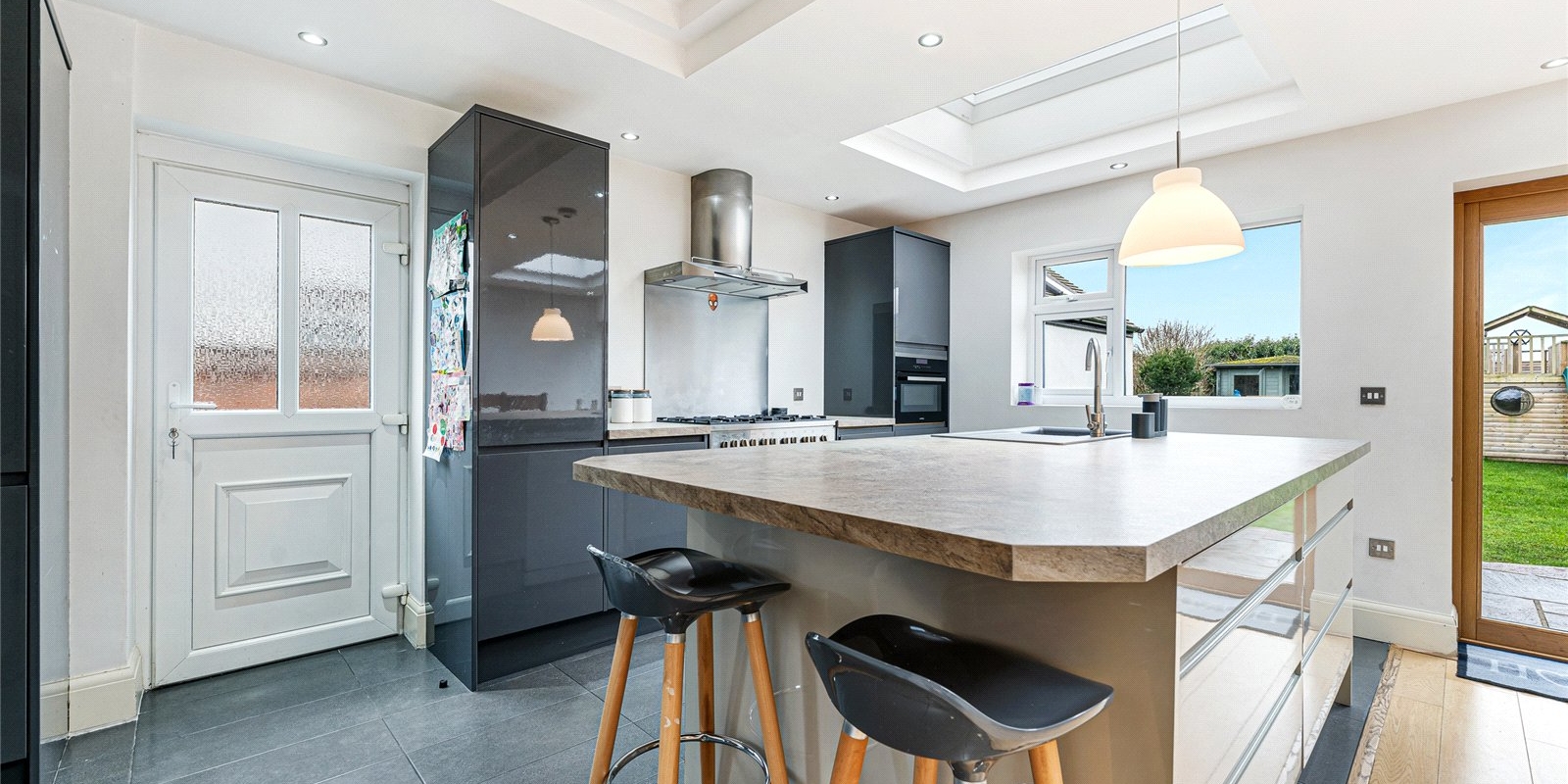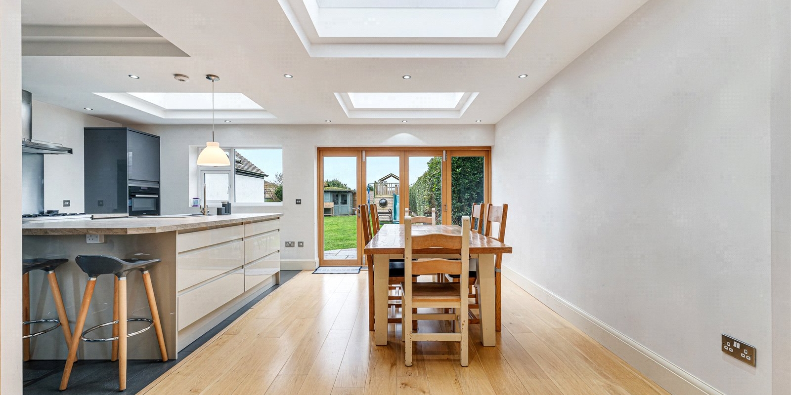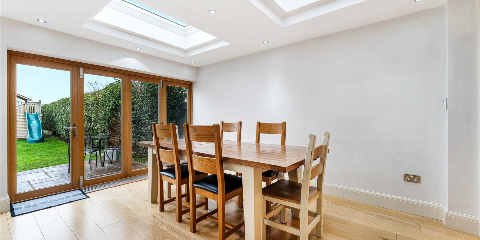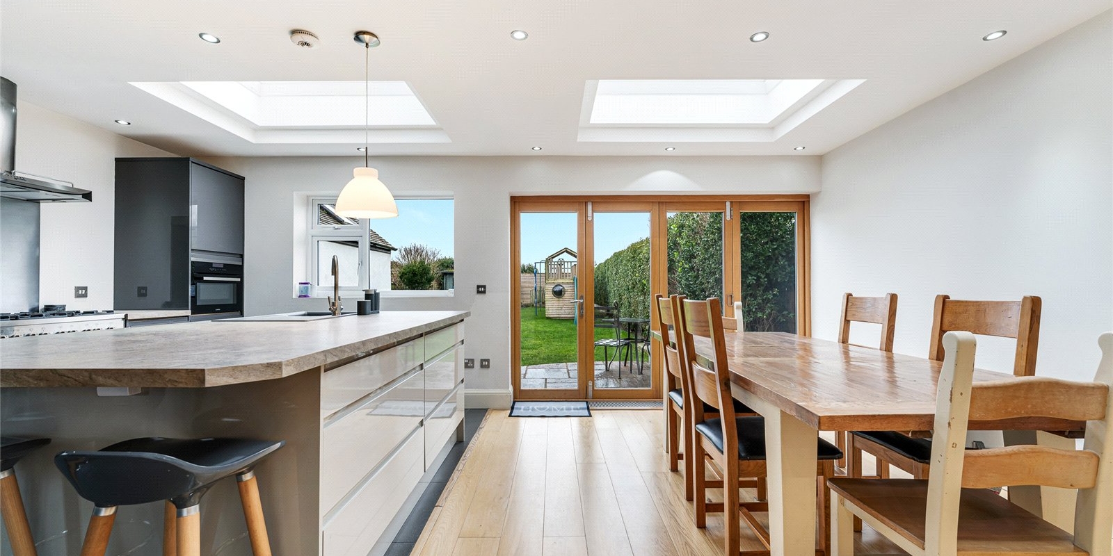 At the heart of the home is the modern kitchen, fully integrated and thoughtfully designed with a central island and ample dining space, ideal for family life and hosting. Bifolding doors which lead to the garden. Additional practical features include a full-size utility room and a stylish downstairs WC.