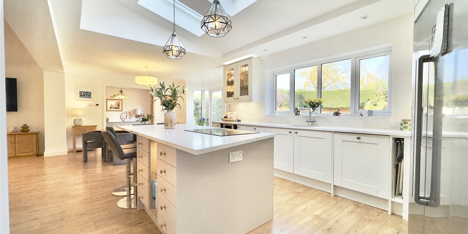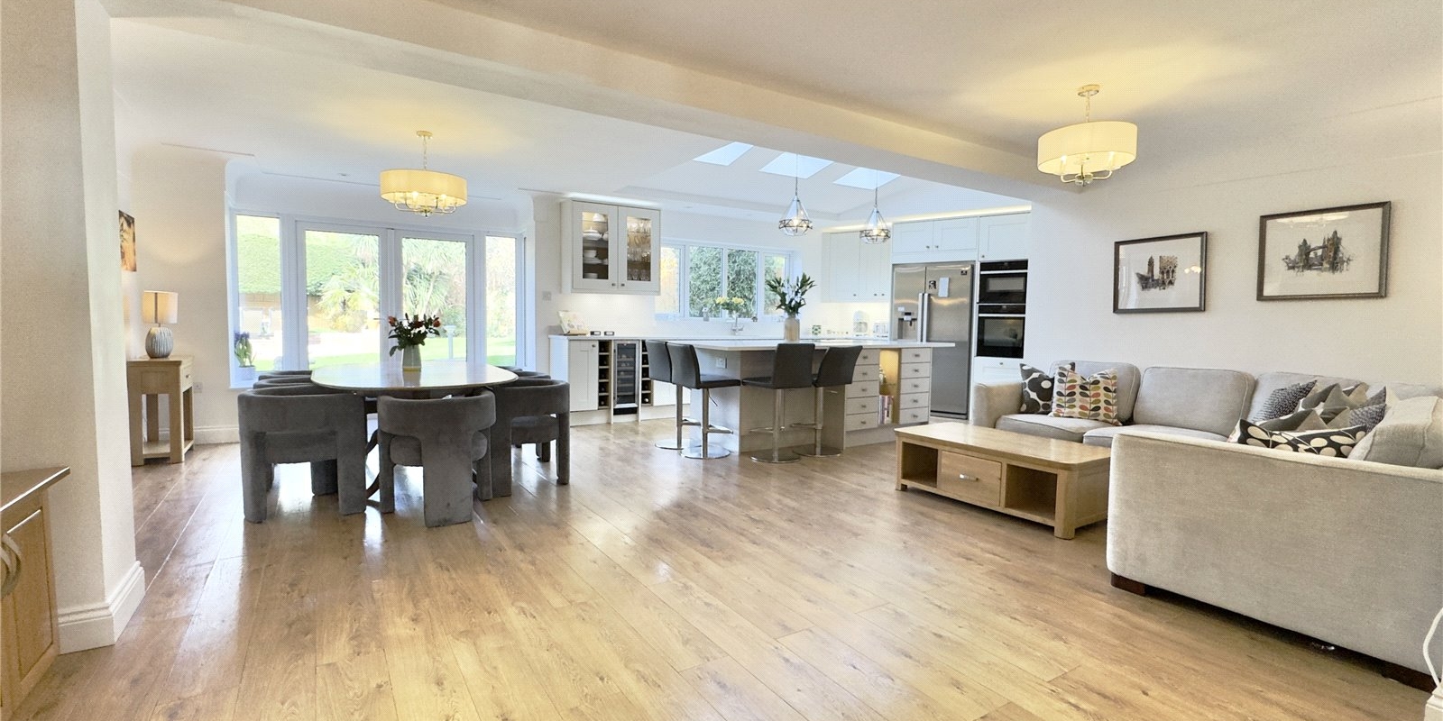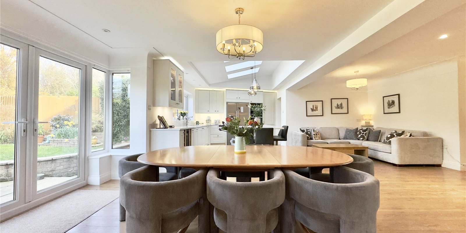 The heart of the home showcases a stunning open-plan kitchen and entertaining area, perfect for family gatherings and dinner parties alike. Additional reception rooms include a dedicated study/office space, comfortable lounge, and separate snug, providing versatility for modern living requirements.