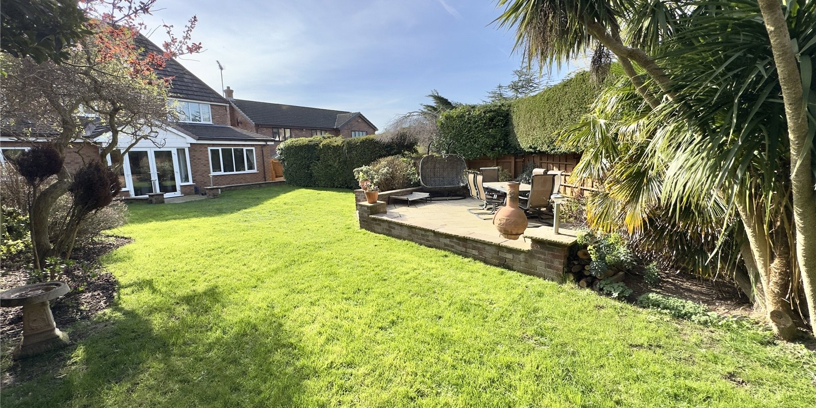 Outside, the mature garden is a particular highlight, featuring well-maintained lawns, established shrubs, and several thoughtfully positioned seating areas. This outdoor sanctuary offers multiple spaces for relaxation and entertainment throughout the seasons.