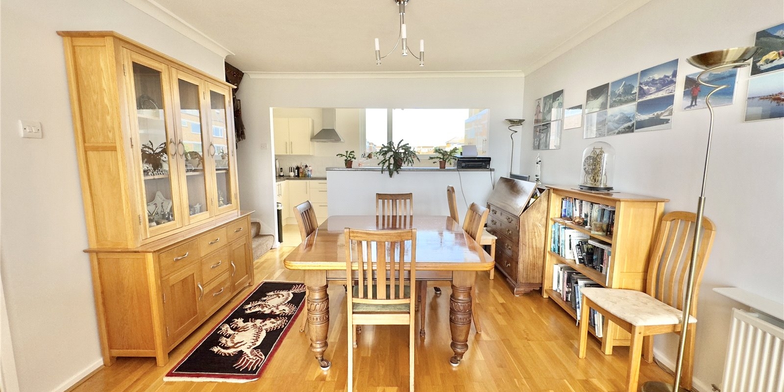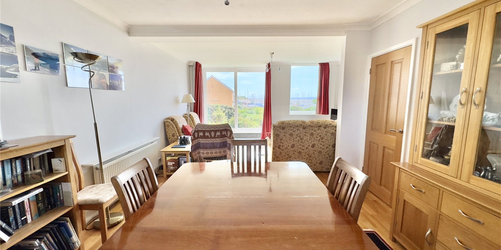 Upstairs to the first floor, you will be welcomed into the lounge, dining and open plan kitchen area. The lounge has an enclosed bay window to maximise on the views and affords extra floor space for cosy seating. Currently laid with an oak floor, the dining room and lounge flow seamlessly to the fitted kitchen with integral appliances.