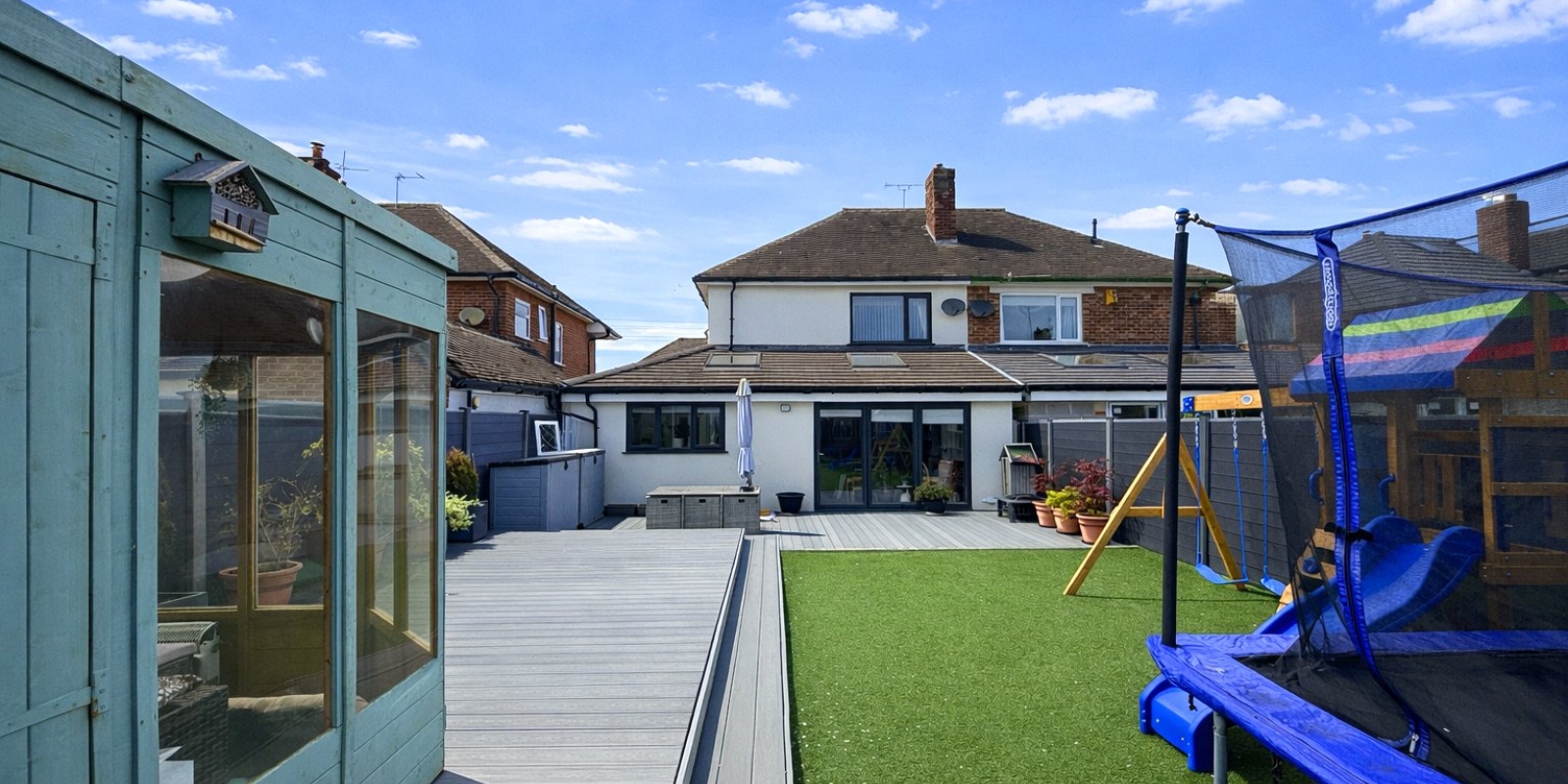 Externally, the landscaped rear garden offers a low-maintenance mix of patio and lawn, perfect for relaxing, family time, or entertaining.