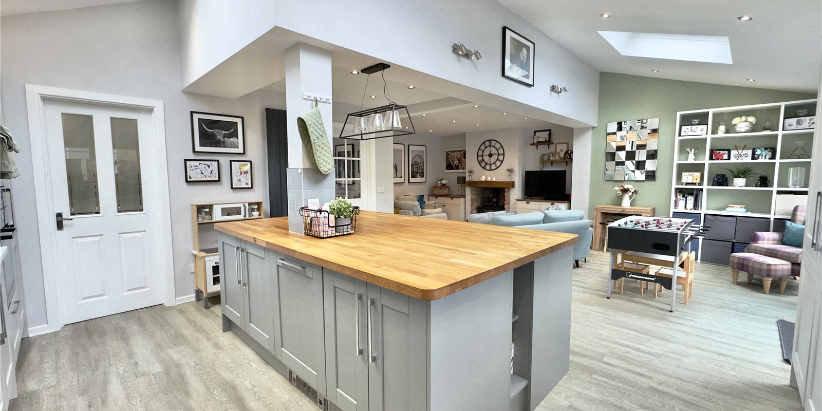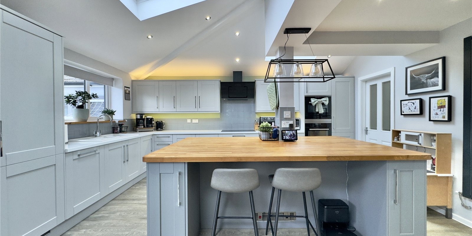 The rear of the property is undoubtedly the showpiece of the home, designed with both entertaining and everyday living in mind. The impressive extended open-plan kitchen, dining, and snug area creates a sociable hub where family and friends can gather. The stylish kitchen features a central island, perfect for casual breakfasts, coffee mornings, or hosting, along with integrated appliances and ample workspace for keen cooks. The snug area, complete with a wood-burning stove, provides a warm and inviting space during colder months, while the bi-folding doors open fully onto the garden, allowing for seamless indoor-outdoor living in the summer, ideal for barbecues, celebrations, or simply enjoying the sunshine. A separate utility room adds practicality and keeps the main living space clutter-free.